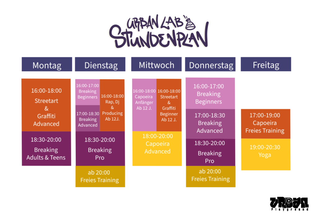 Wir bieten wöchentliche Kurse an. Zusätzlich können Graffiti-Workshops, mit oder ohne Urban Lab Mobil, gebucht werden. Auf Wunsch setzen wir auch individuelle Graffiti-Projekte für euch um.